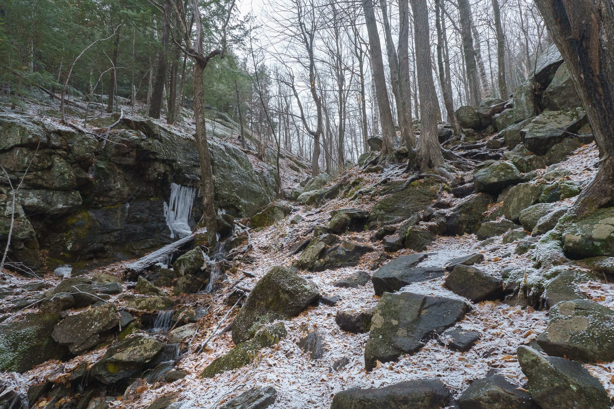 As the trail turned onto a streambed, it became rockier and steeper. There was a thin coating of snow on the rocks, but footing was generally good and there was no need to don the microspikes yet.