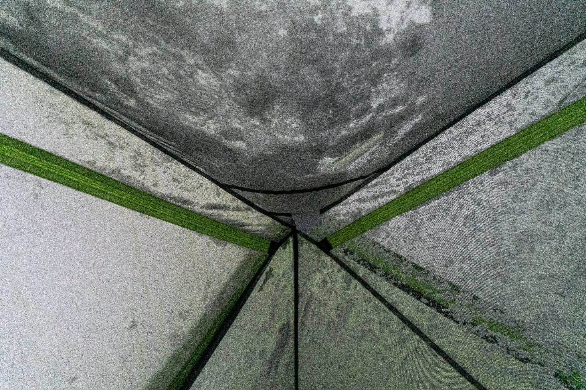Despite the tent fly covering the whole tent, the wind was strong enough to blow powder up it’s skirt and accumulate between the tent and the fly.