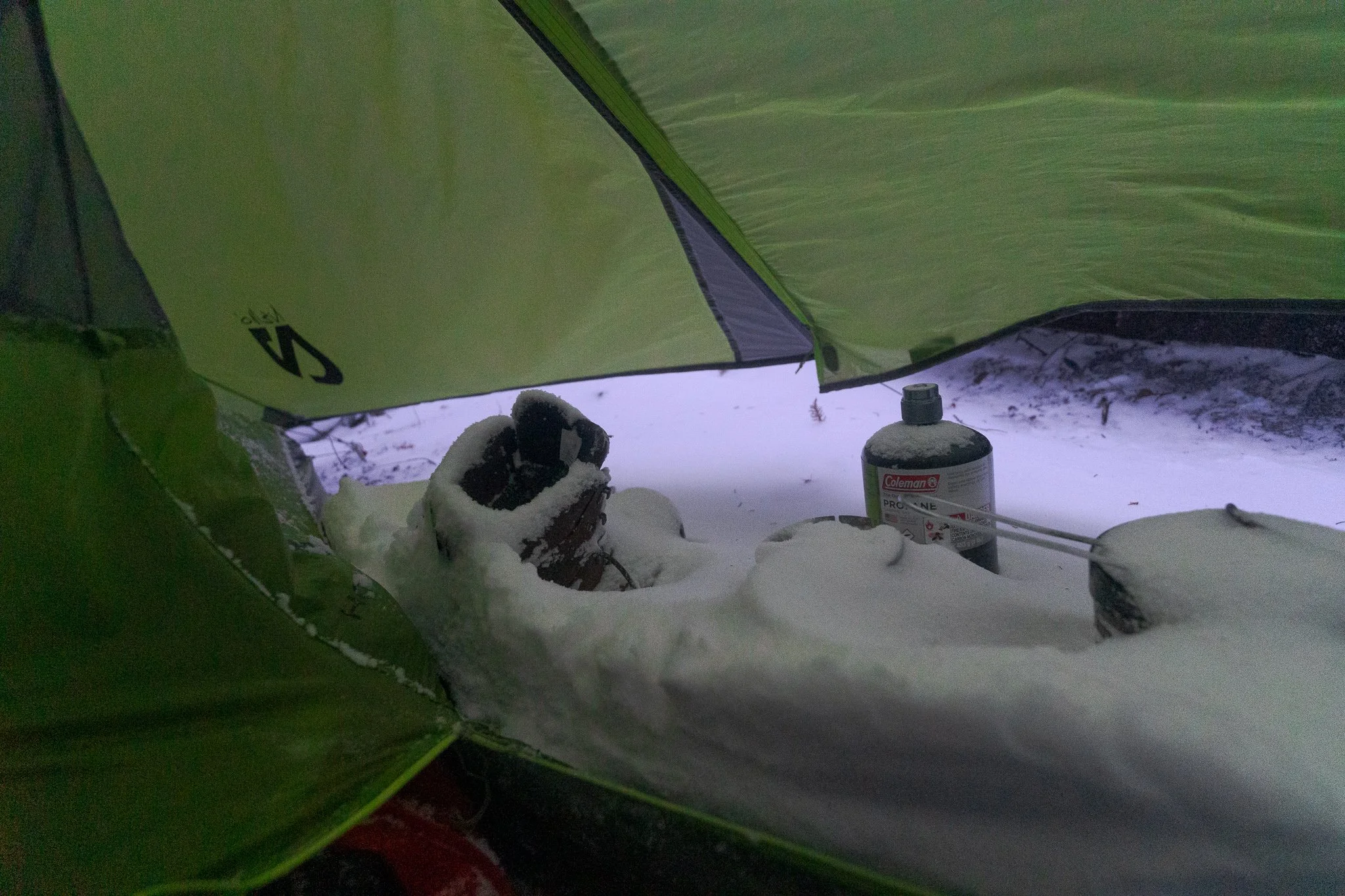 The wind had shoved so much snow up under the tent fly that my boots were not only covered, but filled with snow.